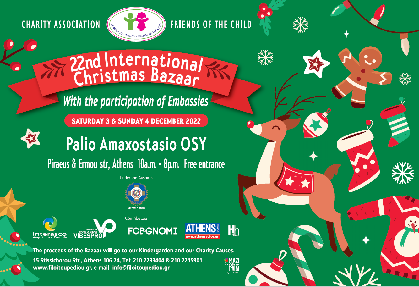 Tisztelt Honfitársaink! Idén is megnyitja kapuit a Friends of the Child jótékonysági szervezet által rendezett Karácsonyi Bazár. Az esemény, amelyen nagykövetségünk is részt vesz 2022. december 3-án és 4-én kerül megrendezésre a tavalyi helyszínen: Old Depot OSY (Παλιό Αμαξοστάσιο ΟΣΥ), 105 53 Piraeus és Ermu utca sarok, a Technopolis-al szemben. Standunkon kürtős kalácsot, magyar borokat és élelmiszereket vásárolhatnak az érdeklődők. Várunk mindenkit szeretettel!!