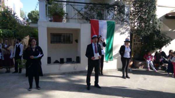 Az ünnepi megemlékezésen meghívott vendégként adott előadást az athéni ELKELAM néptánccsoport, akik évek óta a magyar néptánc görögországi népszerűsítésén fáradoznak. Nagykövetségünk kihelyezett és helyi magyar alkalmazottai, a meghívott magyar kolónia tagjaival együtt rövid műsorban mutatták be az 1848-as márciusi események főbb mozzanatait. A megjelent magyar családok kisgyermekeinek külön kézműves foglalkozást is tartottunk, a fent említett görög néptánccsoport pedig játékos keretek között mutatta meg a magyar néptánc legegyszerűbb alaplépéseit. Az ünneplést estig tartó szabadtéri összejövetel követte.